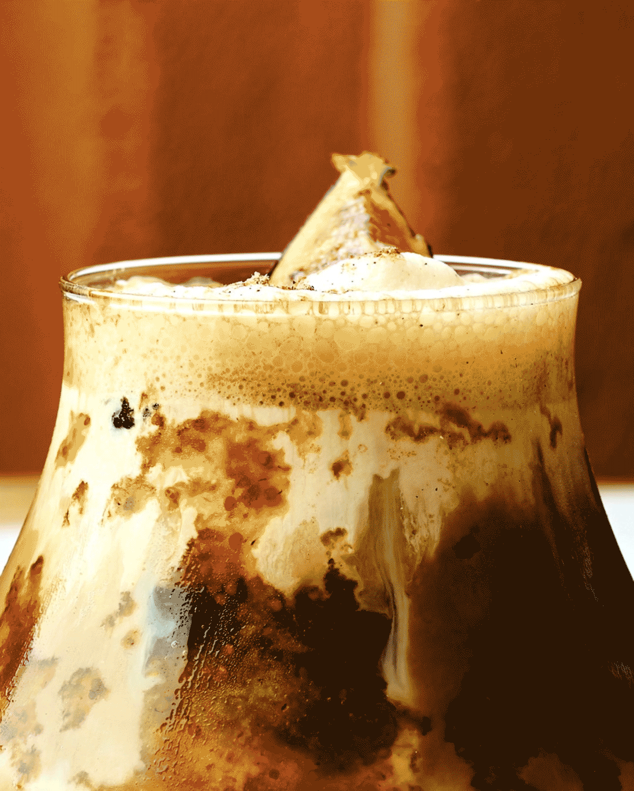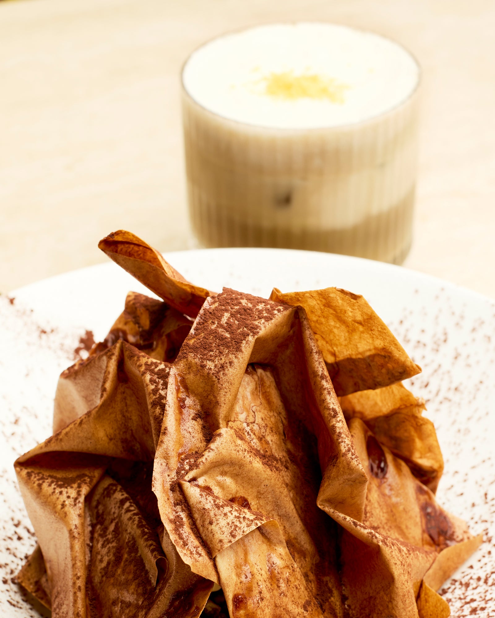 Banana Toffee Crackle. A crackling cocoa shell giving way to banana ice cream, brown-butter financier, stewed banana, ribbons of honey toffee, and caramelised pecans.