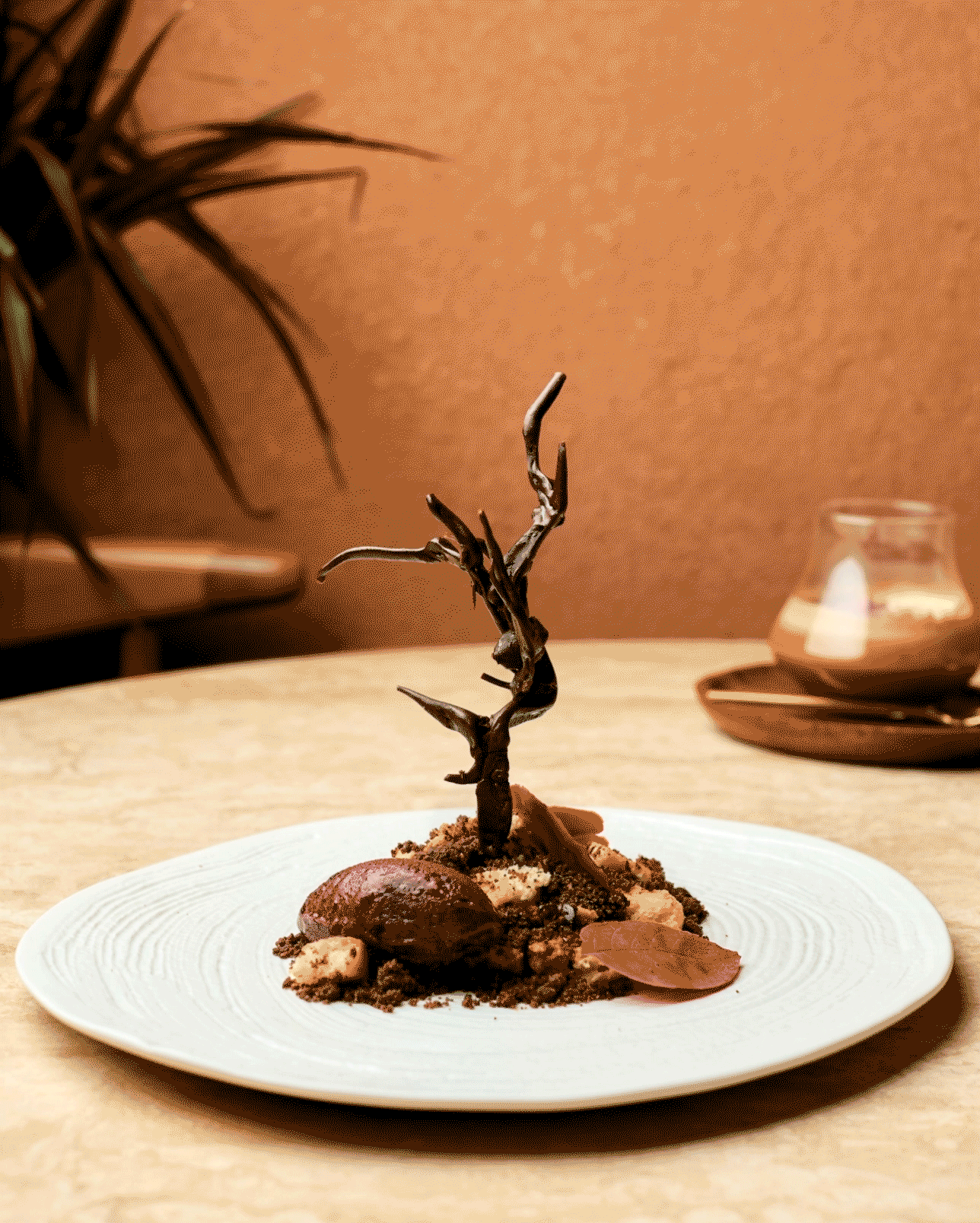 The Pistachio Project. A crisp chocolate-pistachio shell filled with aerated pistachio mousse, mandarin purée, pistachio sponge, and pistachio sorbet on toasted crumble.