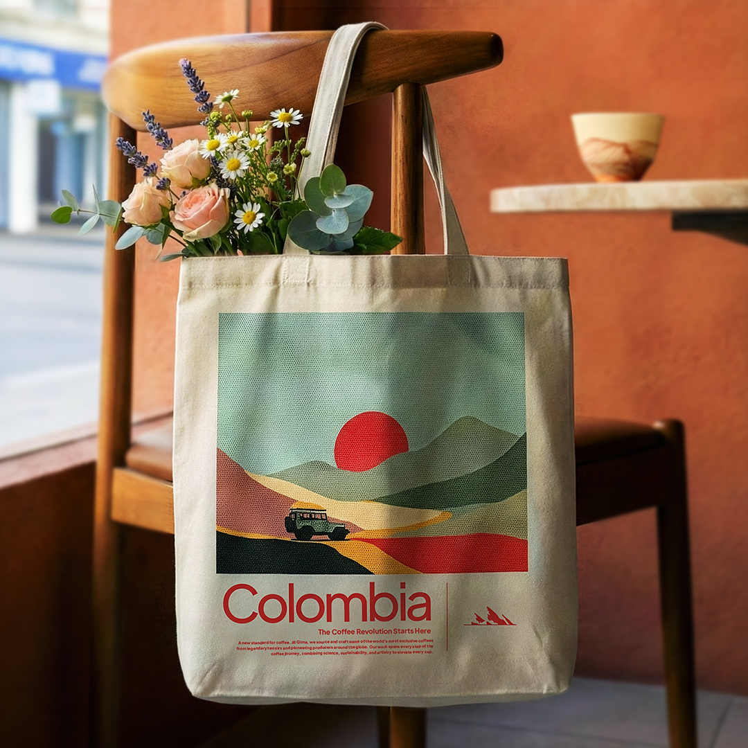 Our Best Served Bold tote features a stylised Colombian landscape, with rolling mountains, warm horizons, and a 4x4 loaded with coffee travelling through origin terrain. The illustration celebrates the expressive, character-driven spirit behind some of the world’s most vibrant coffees.