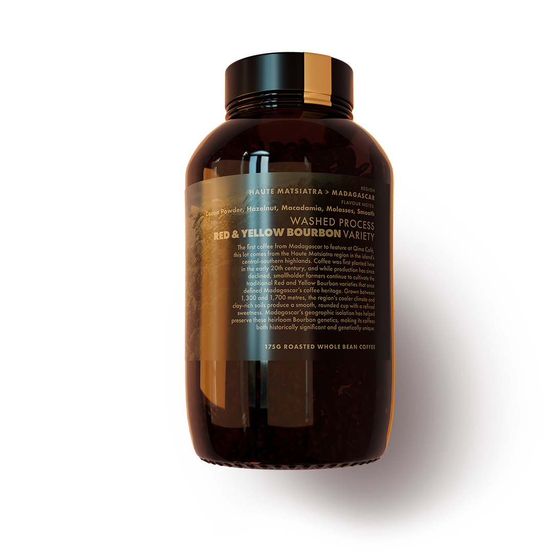 The first coffee from Madagascar to feature at Qima Café, this lot comes from the Haute Matsiatra region in the island’s central-southern highlands. Coffee was first planted here in the early 20th century, and while production has since declined, smallholder farmers continue to cultivate the traditional Red and Yellow Bourbon varieties that once defined Madagascar’s coffee heritage.