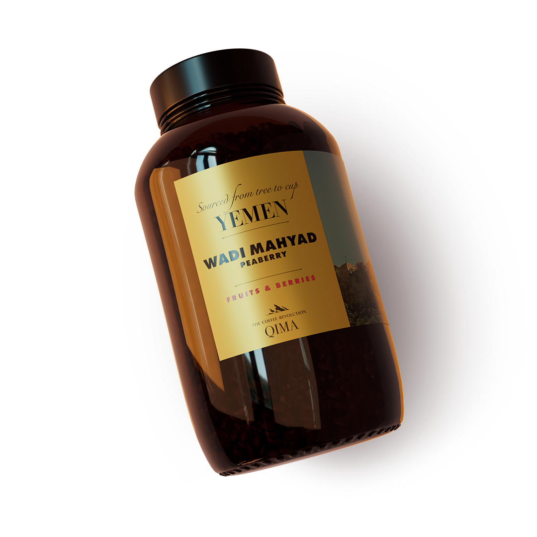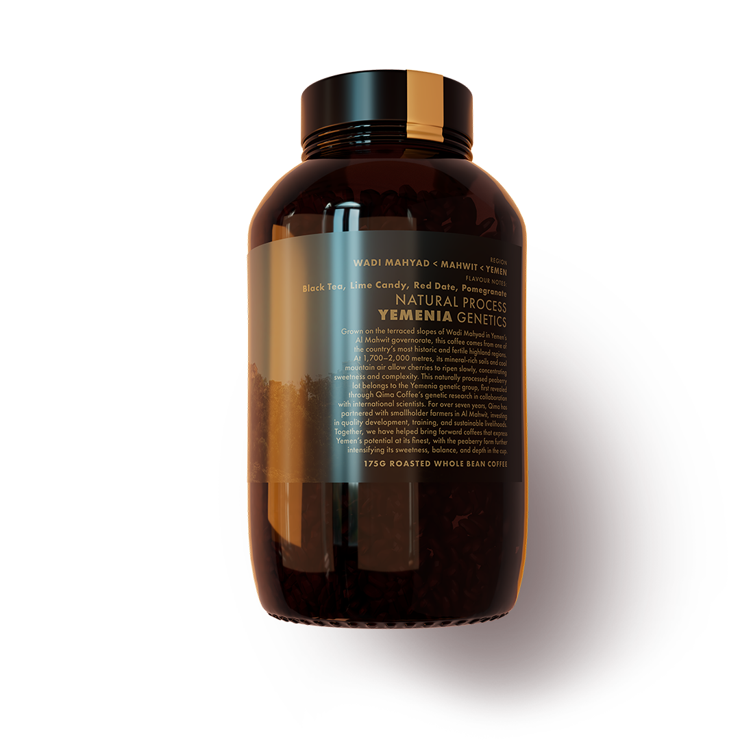 Grown on the terraced slopes of Wadi Mahyad in Yemen’s Al Mahwit governorate, this coffee comes from one of the country’s most historic and fertile highland regions. At 1,700–2,000 metres, its mineral-rich soils and cool mountain air allow cherries to ripen slowly, concentrating sweetness and complexity. This naturally processed peaberry lot belongs to the Yemenia genetic group, first revealed through Qima Coffee’s genetic research in collaboration with international scientists.